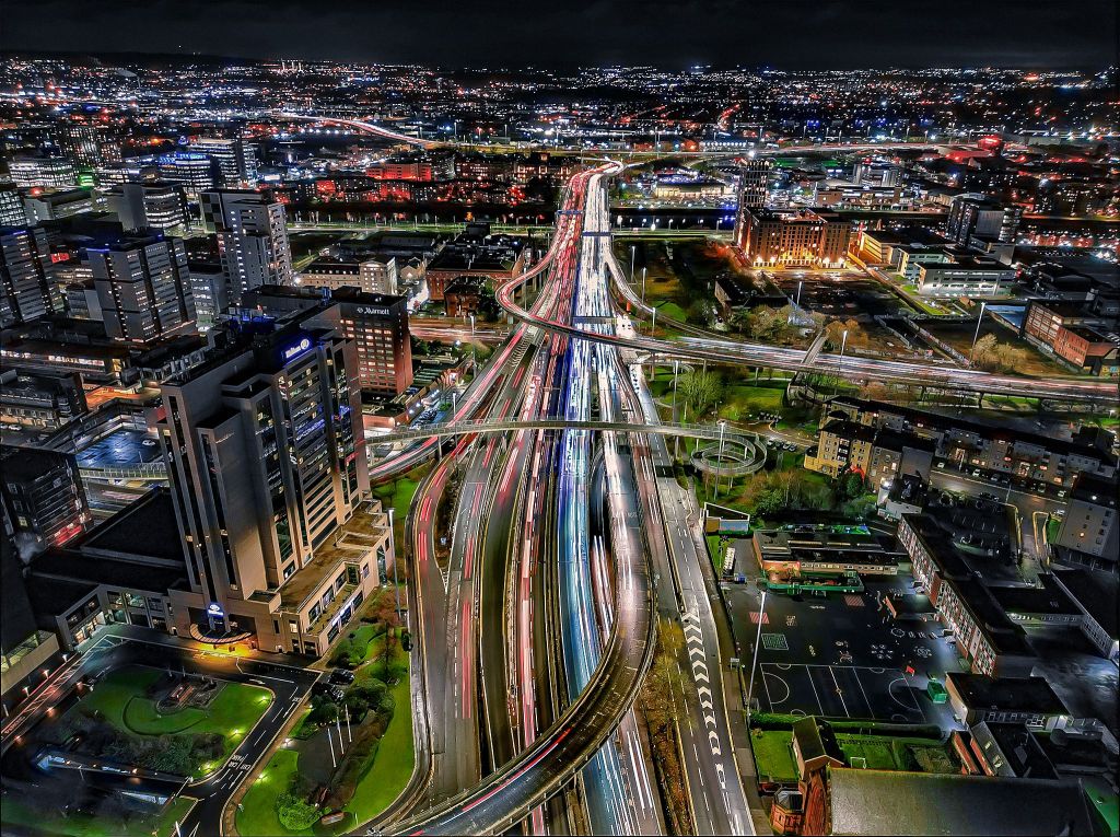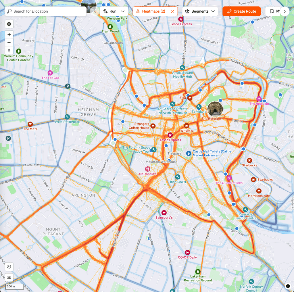 The final section, ‘Glasgow Sonnets’, rings a more sonorous, melancholy note as it muses on Glasgow past and present and brings me back to my heatmap of Norwich. Navigating the M8 in central Glasgow makes my palms sweat and raises my pulse. On and off ramps are truncated. Vehicles enter and exit from both the left and the right. Congestion hides lane markings. The lines on my heat map represent points of contact between feet and street. They represent a deepening connection between person and place, whereas Lang visualises the M8 as a botched operation, a false hope: ‘Flyovers, wance the future, / dissect the city / n send it tae an early grave’. ‘The air is thick’ with the modern embodiment of a pea-souper, ‘n awready everybody / hus forgotten aboot Rosebank‘ and our attention spans struggle to extend much beyond the current news cycle. Like lab rats, we’re ‘going to root the inner/outer / circle in the dark’, like the denizens of Dante’s Inferno.